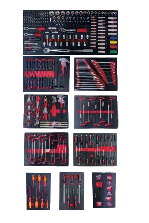 - 10 met gereedschap gevulde schuimstof inlays: De laden zijn voorzien van 10 schuimstof inlays die zorgvuldig zijn gevuld met een uitgebreide set professioneel gereedschap. De inlays houden het gereedschap netjes op zijn plaats en beschermen tegen beschadigingen.